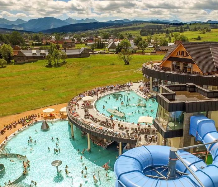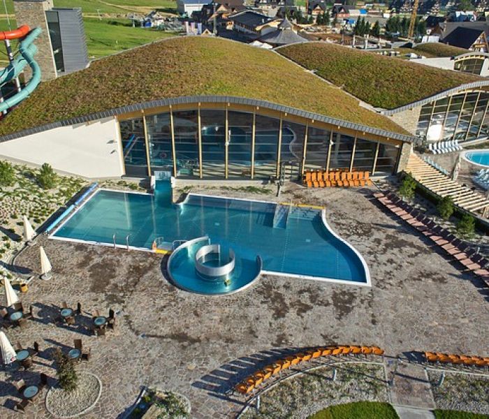 Są największym kompleksem termalnym na Podhalu. Niebywała przestrzeń pozwala na wypoczynek w komfortowych warunkach, niezależnie od liczby osób w obiekcie. Mnogość atrakcji, duże baseny zewnętrzne, przylegające do nich połacie plaż trawiastych oraz szum pobliskiej rzeki Dunajec. Dodajmy do tego jeszcze atrakcje dla dzieci i rysuje się przed nami perspektywa nie lada zabawy. Łączna powierzchnia lustra wody to niemal 3000 m2. Głębokość basenów termalnych mieści się w przedziale 1 – 1,2 m. W przerwie pomiędzy kąpielami a kąpielami, zapraszamy do Bistro Baru lub Kawiarni. Dla rodziców przygotowaliśmy małe udogodnienie. Przy kawiarni znajduje się pokój zabaw AKWARIUM – dziecko spędzi tam chwile na zabawie, gdy dorośli będą mieli okazję delektować się kuchnią.